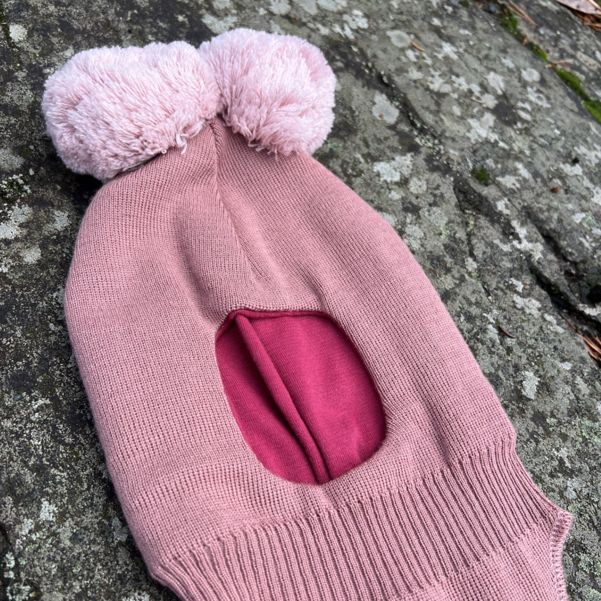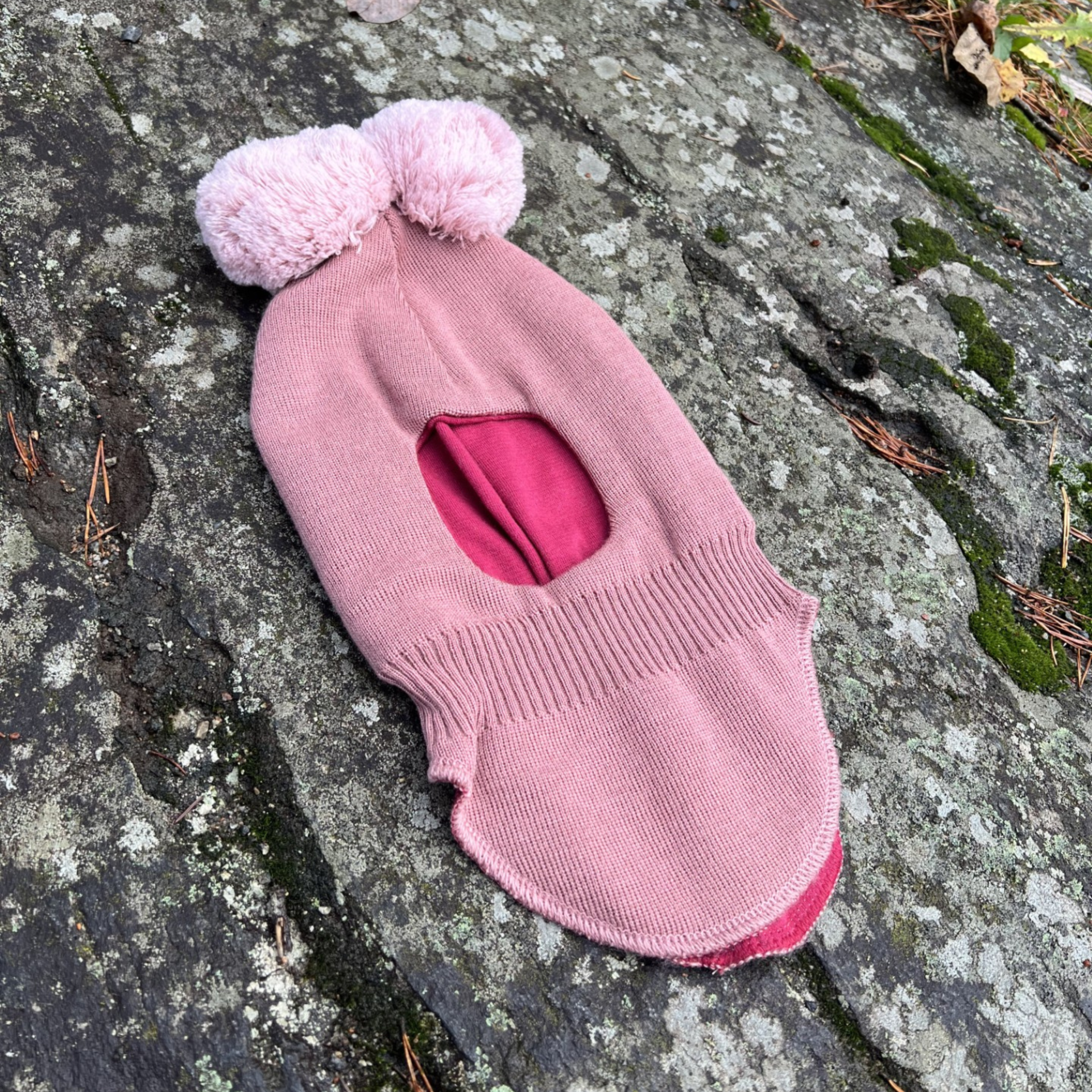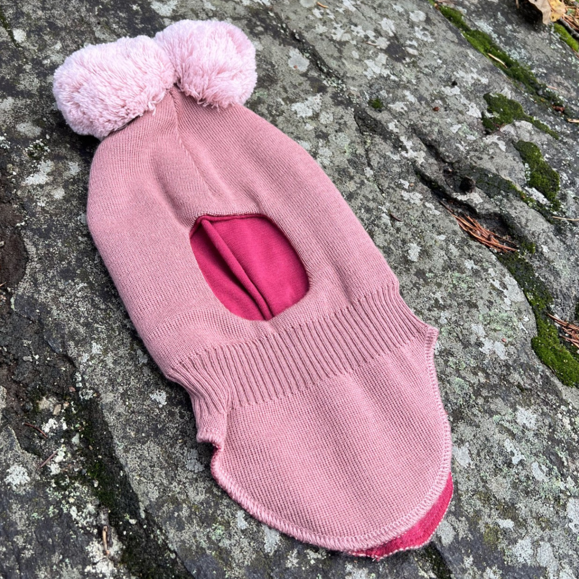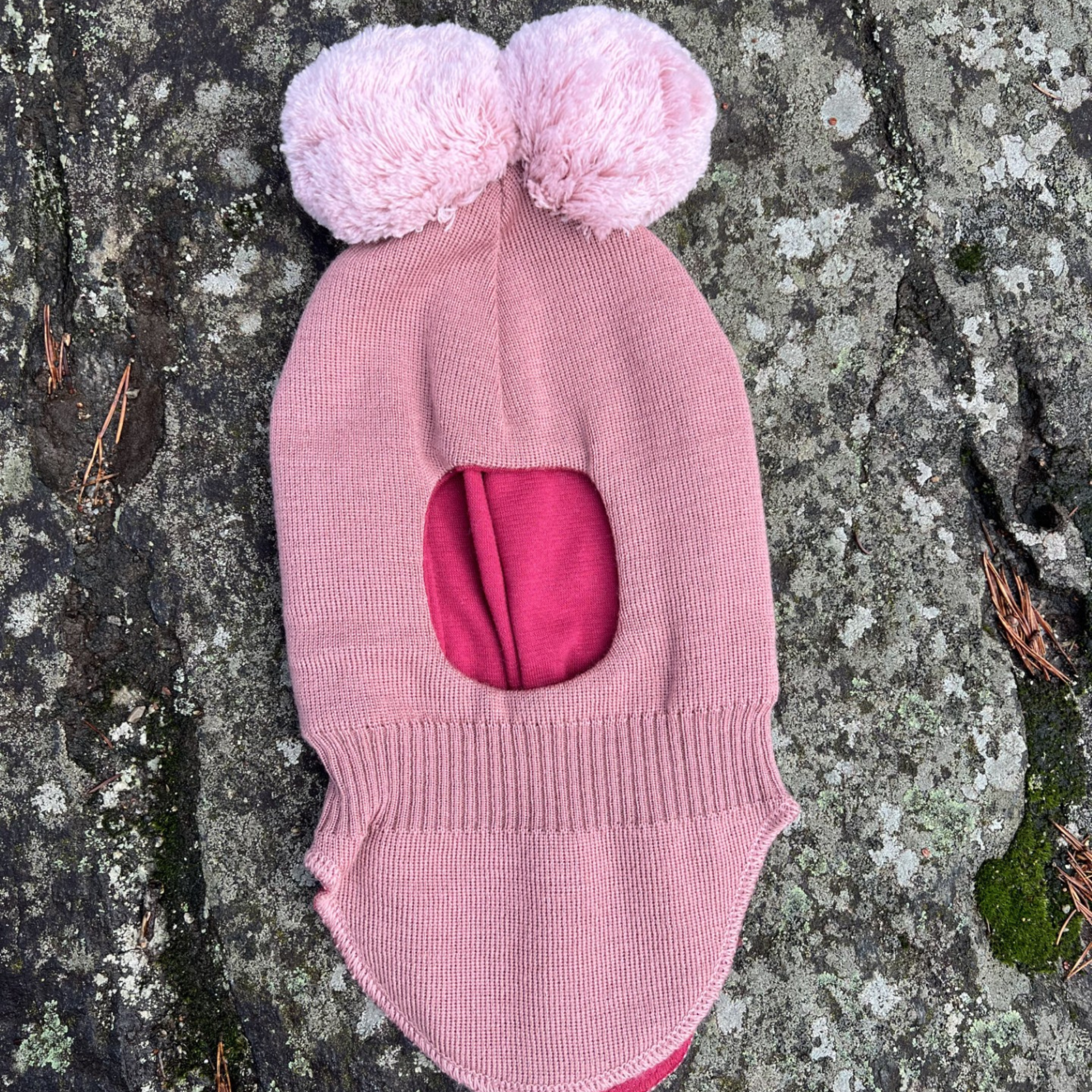 Merinovilla kypärämyssy kahdella tupsulla/ roosa, koko 6-12kk